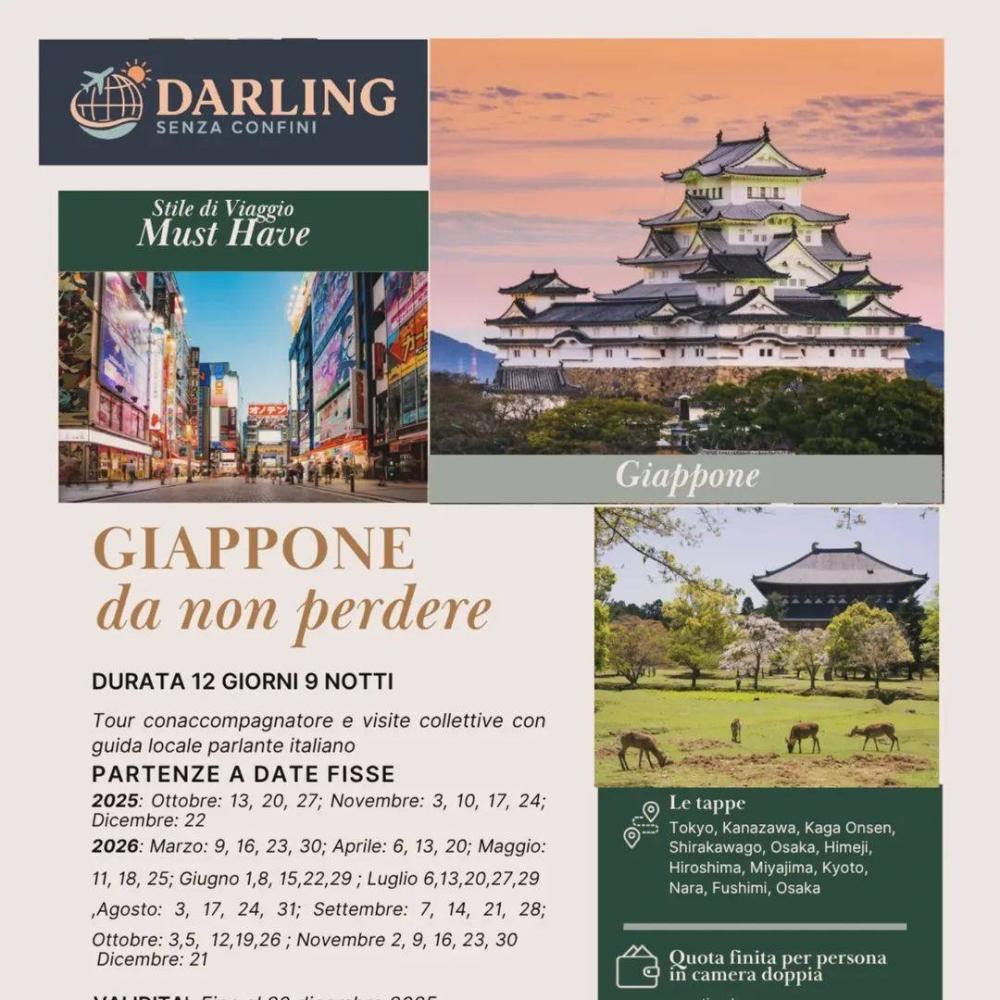 GIAPPONE DA NON PERDERE Un Must Have che resta nel cuore Dal futurismo di Tokyo alla magia di Kyoto: vivi il Giappone che hai sempre sognato #darlingsenzaconfini Viaggio con accompagnatore, visite collettive con guida locale parlante italiano. Durata: 12 giorni / 9 notti. Partenze: Date fisse ( vedi locandina ) Tappe: Tokyo, Kanazawa, Kaga Onsen, Shirakawago, Osaka, Himeji, Hiroshima, Miyashima, Kyoto, Nara, Fushimi, Osaka #travelwithus #travelwithdarling #japantokyo #kyotojapan #darlingsenzaconfini.
